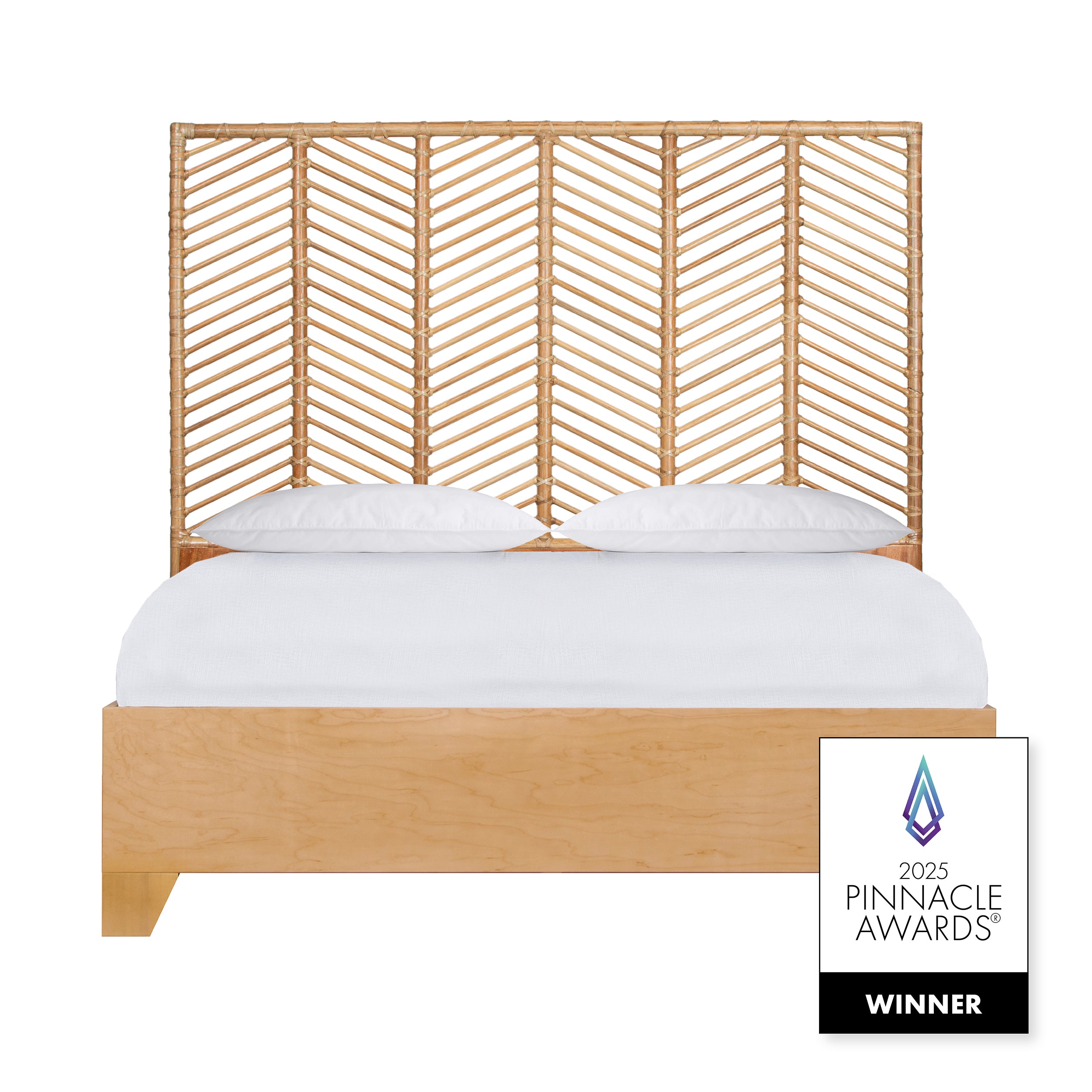 This bed features a Rattan headboard with a Maple Bed Frame. The Rattan headboard is wrapped with Leather Bindings to add beautiful contrast and strength. The Maple Bed Frame is available as a Standard bed frame, to accept a mattress and box spring, or as a Platform style bed, which accepts a mattress only. There are 3 bed leg styles to select from - squared, tapered, and curved. The headboard easily attaches to the bed frame. Each bed is custom-made and finished to order in the USA. This bed is an artistic centerpiece and will make a statement in any room. Constructed by master craftsmen and easily assembled, this bed is built to last.