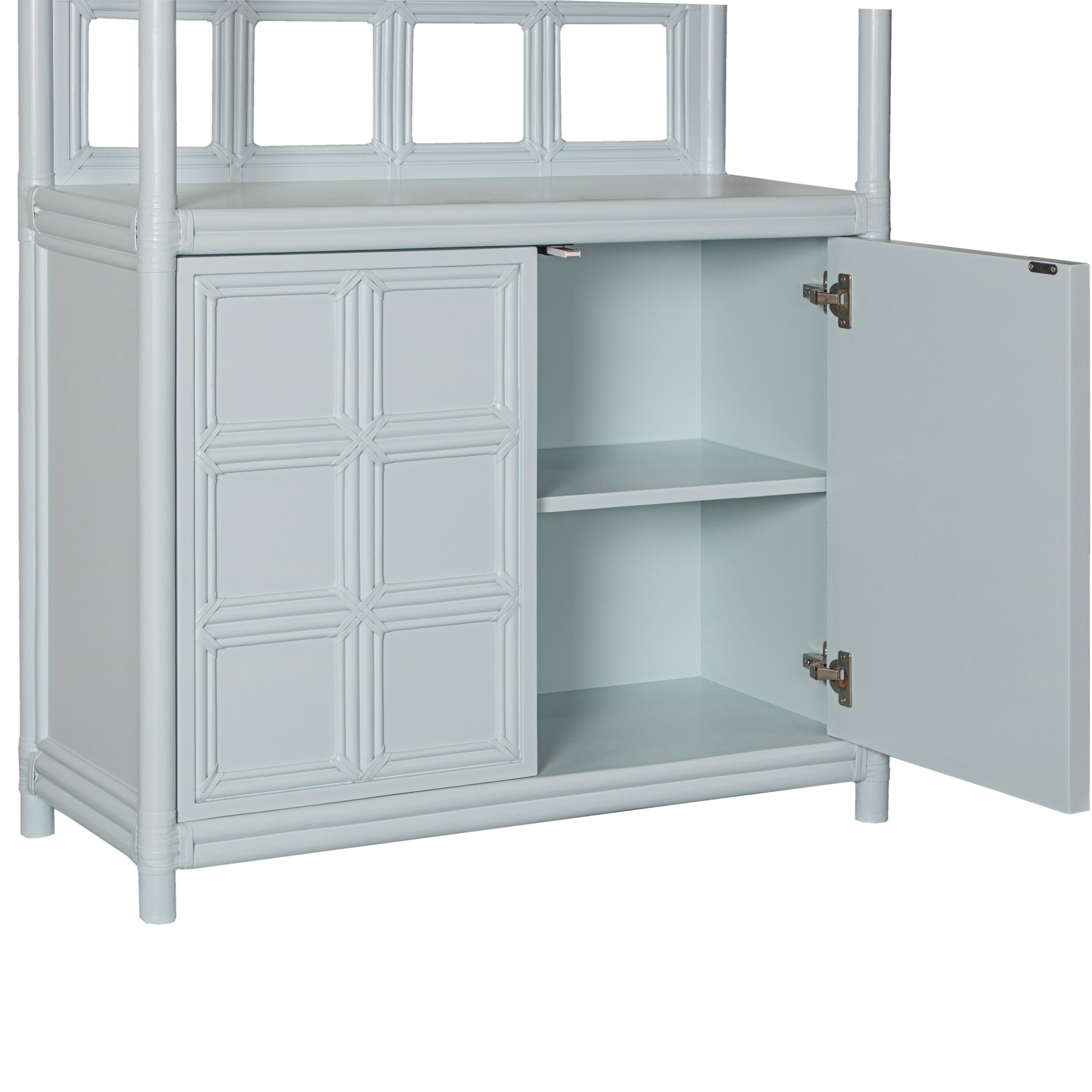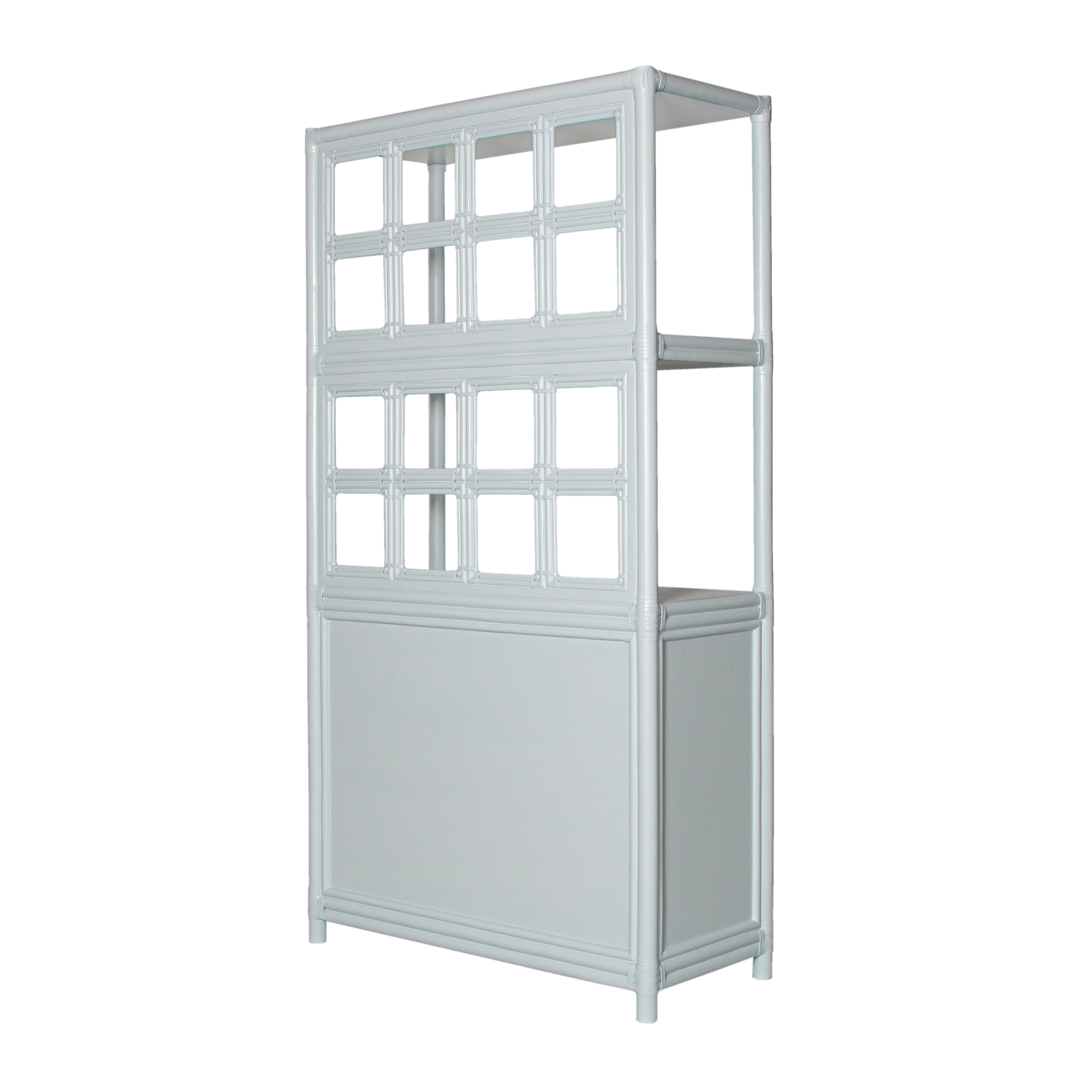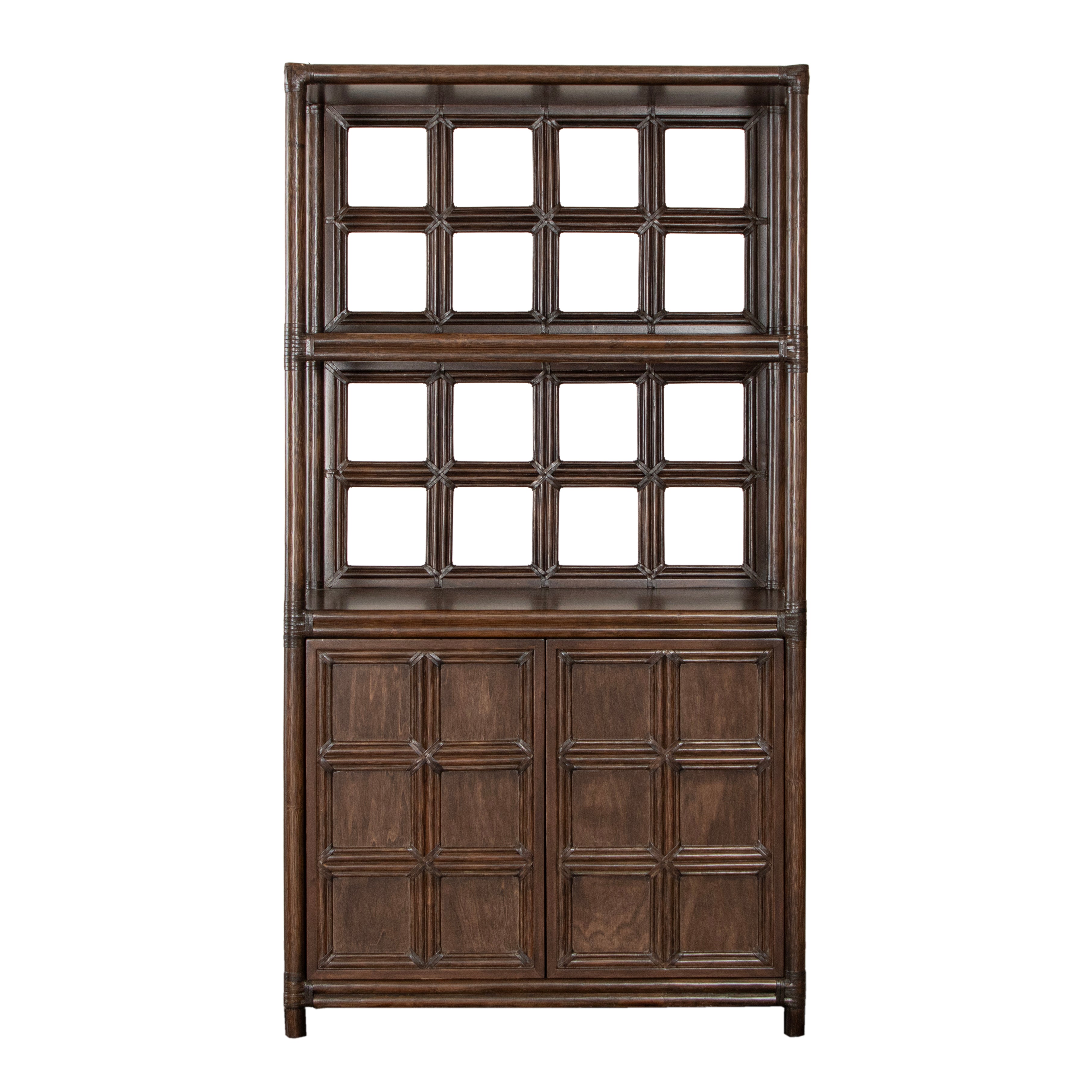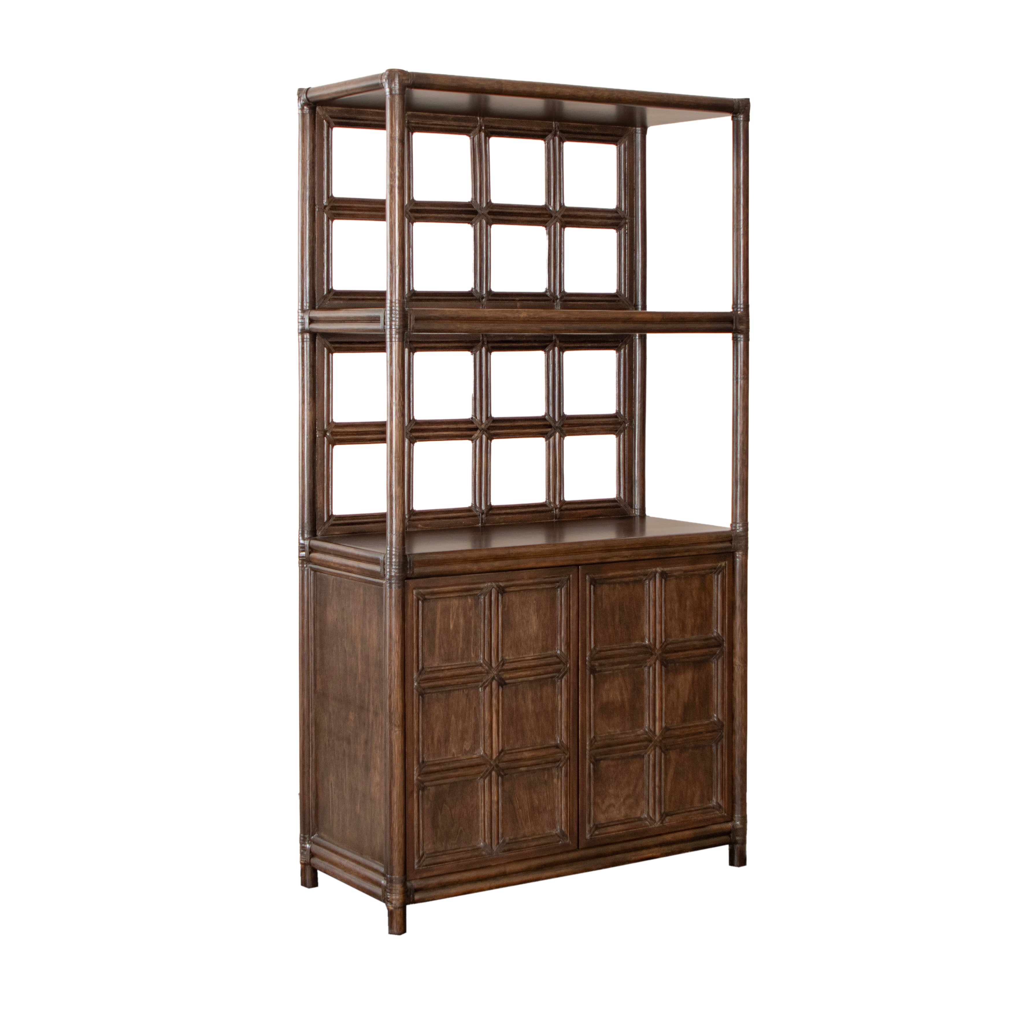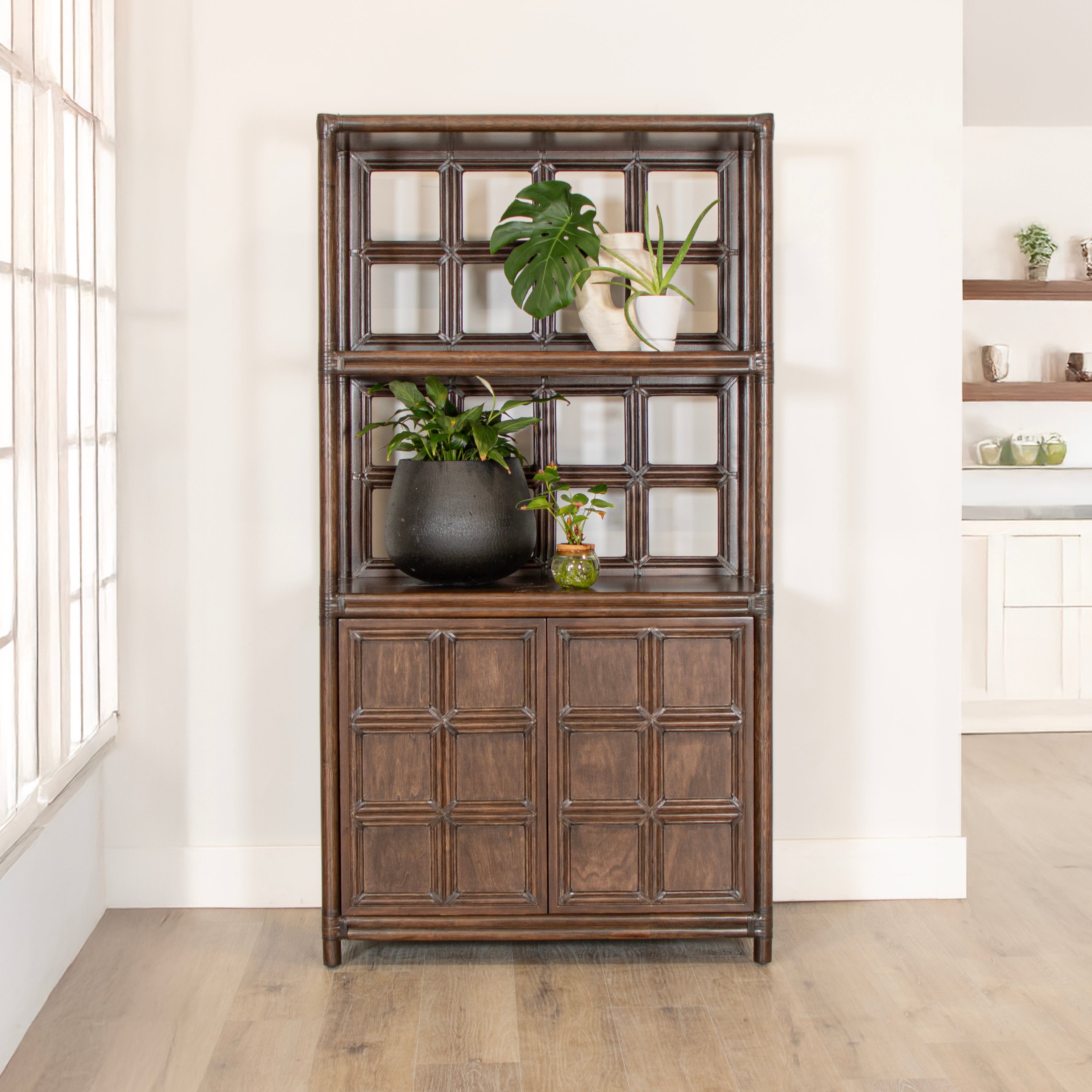 Introducing the Lucca Etagere. Sustainably handcrafted with a wood and rattan frame and leather bindings, this etagere offers 2 shelves and a two door compartment for all your storage needs. Choose from a variety of finishes to match your style. Elevate your space with this exclusive statement piece.