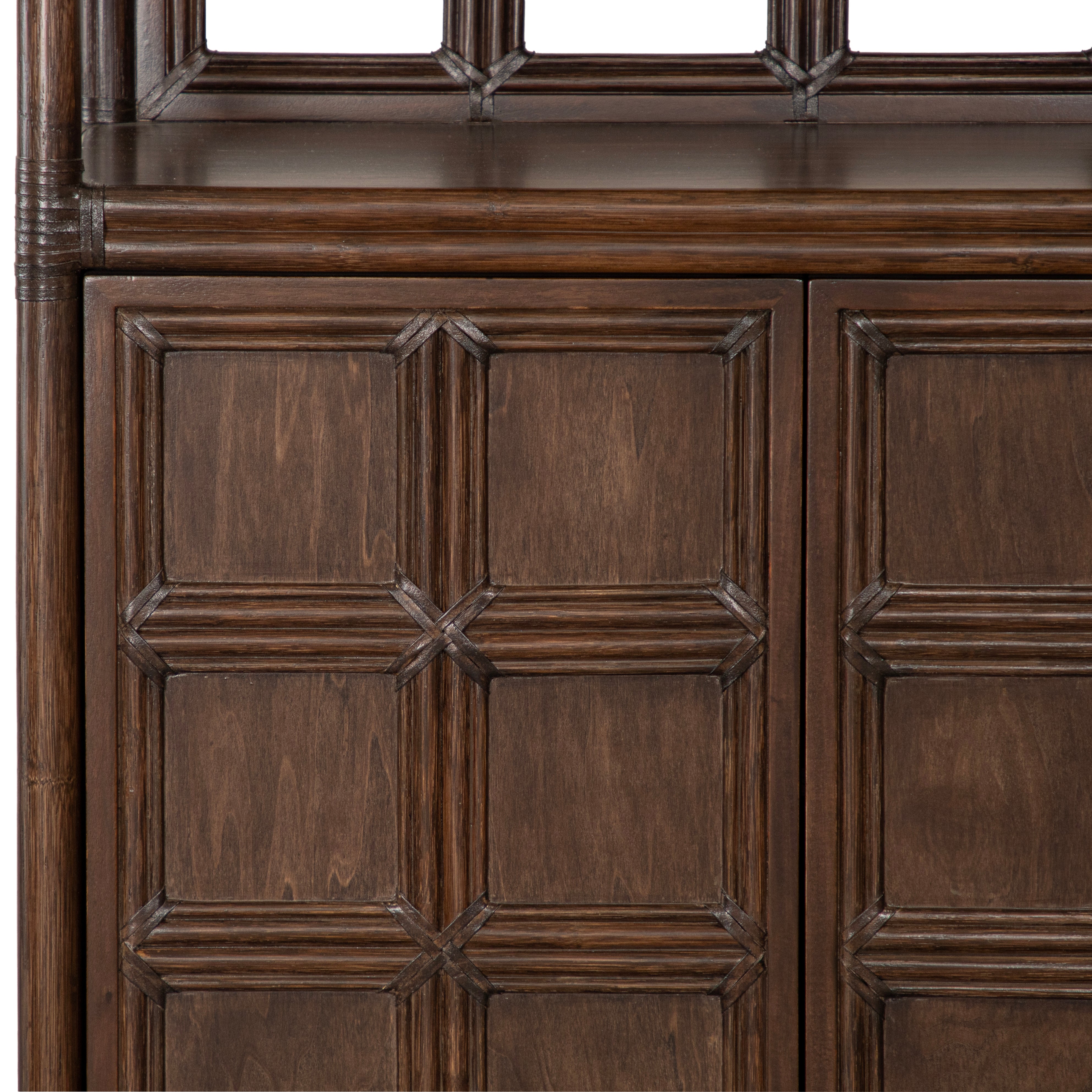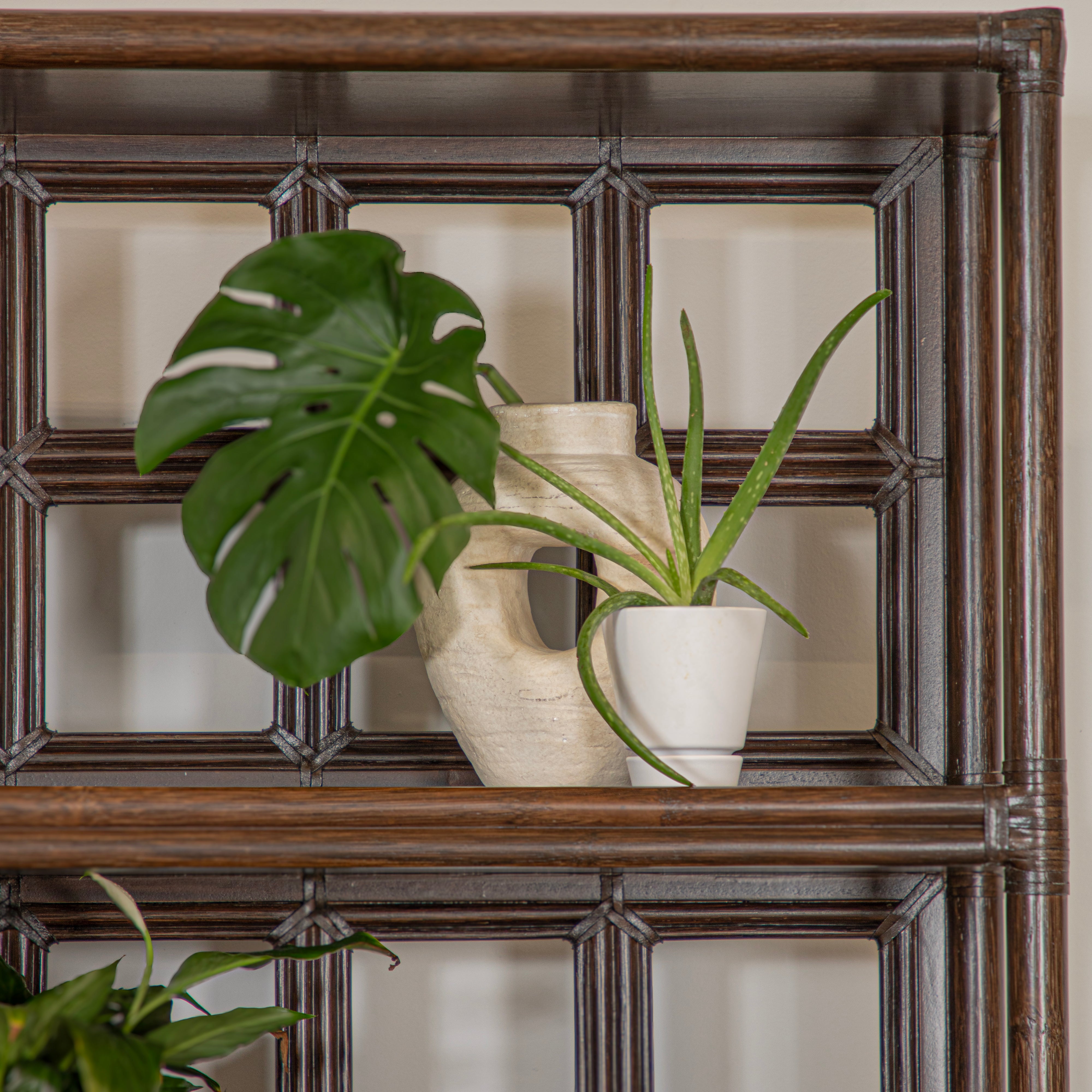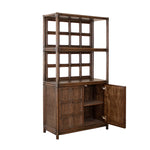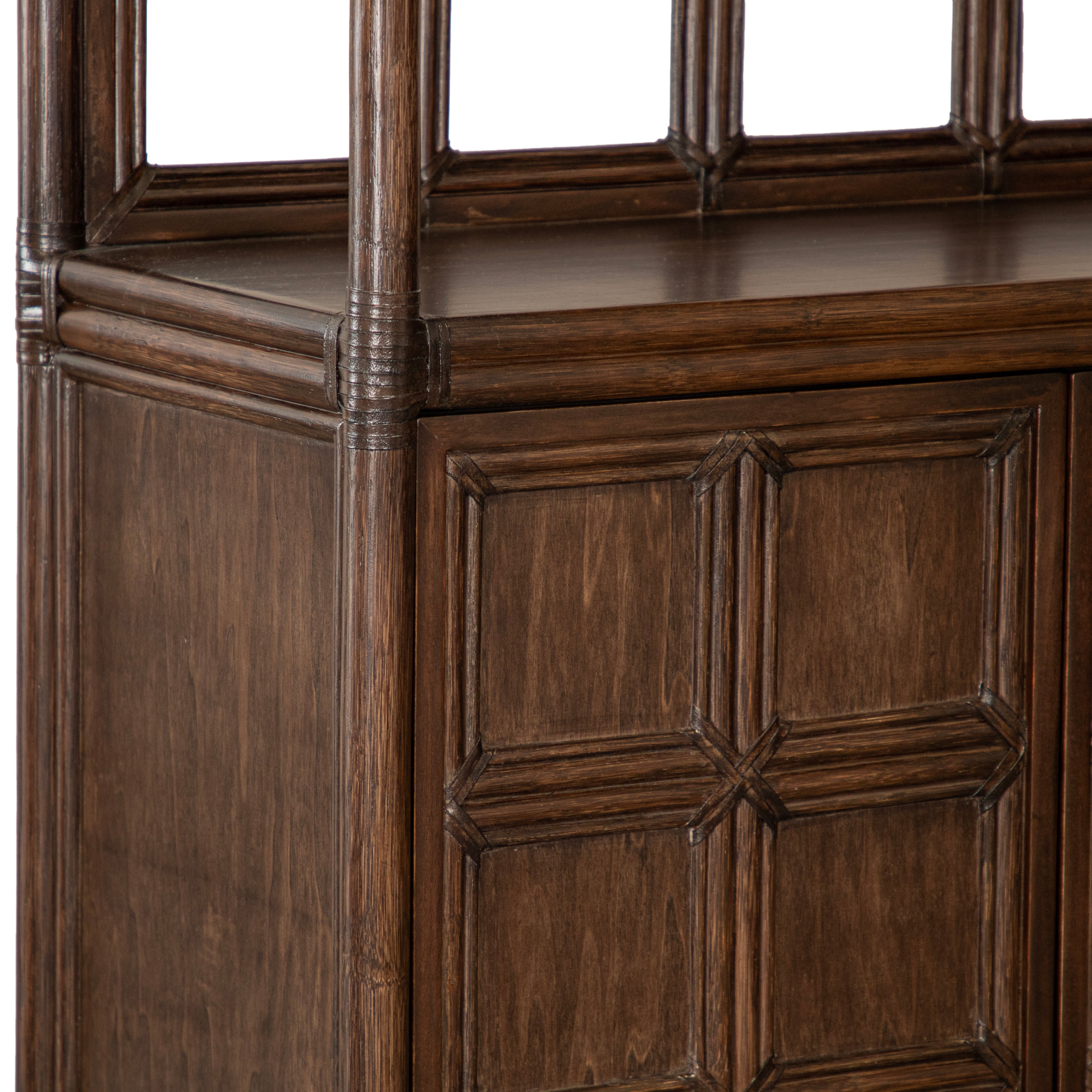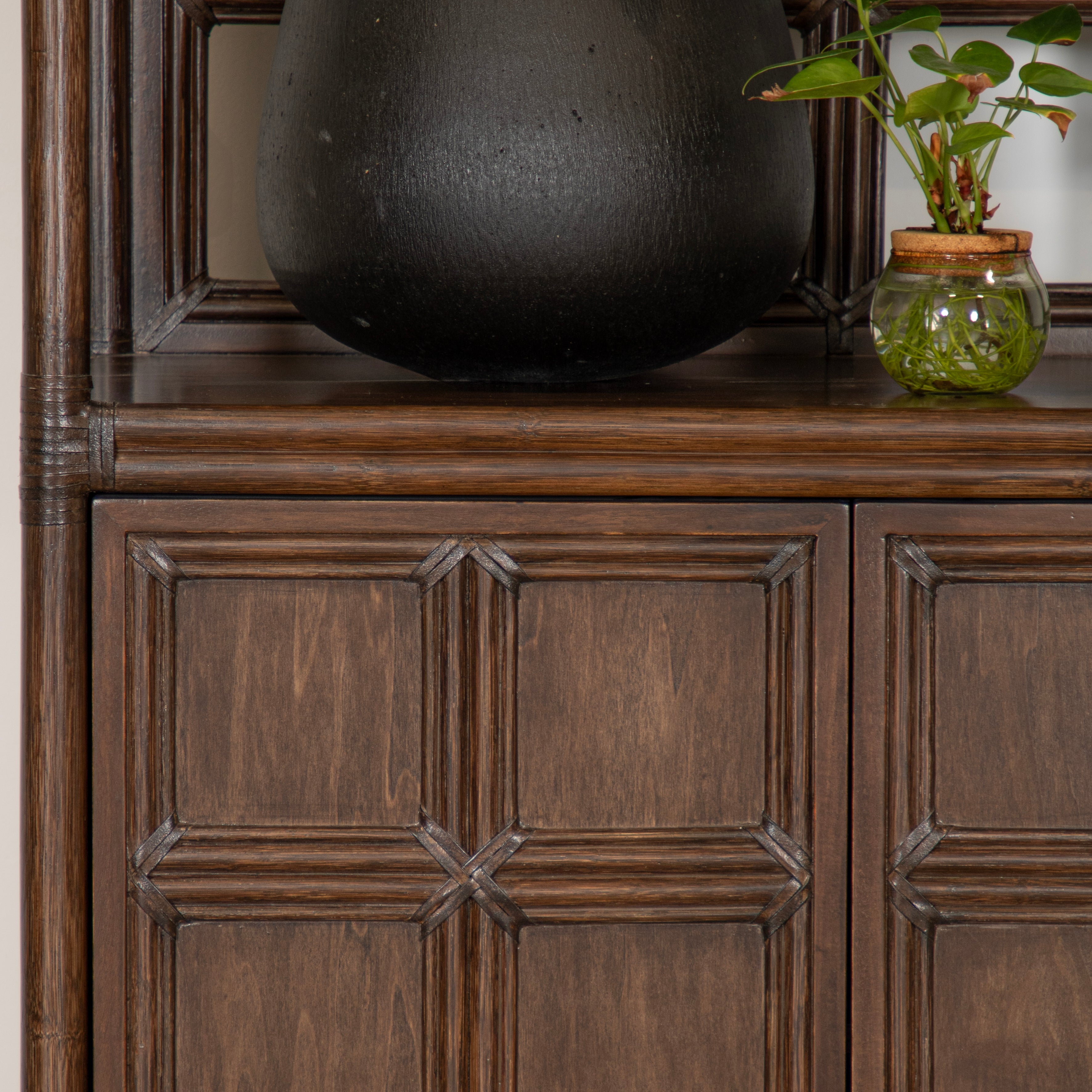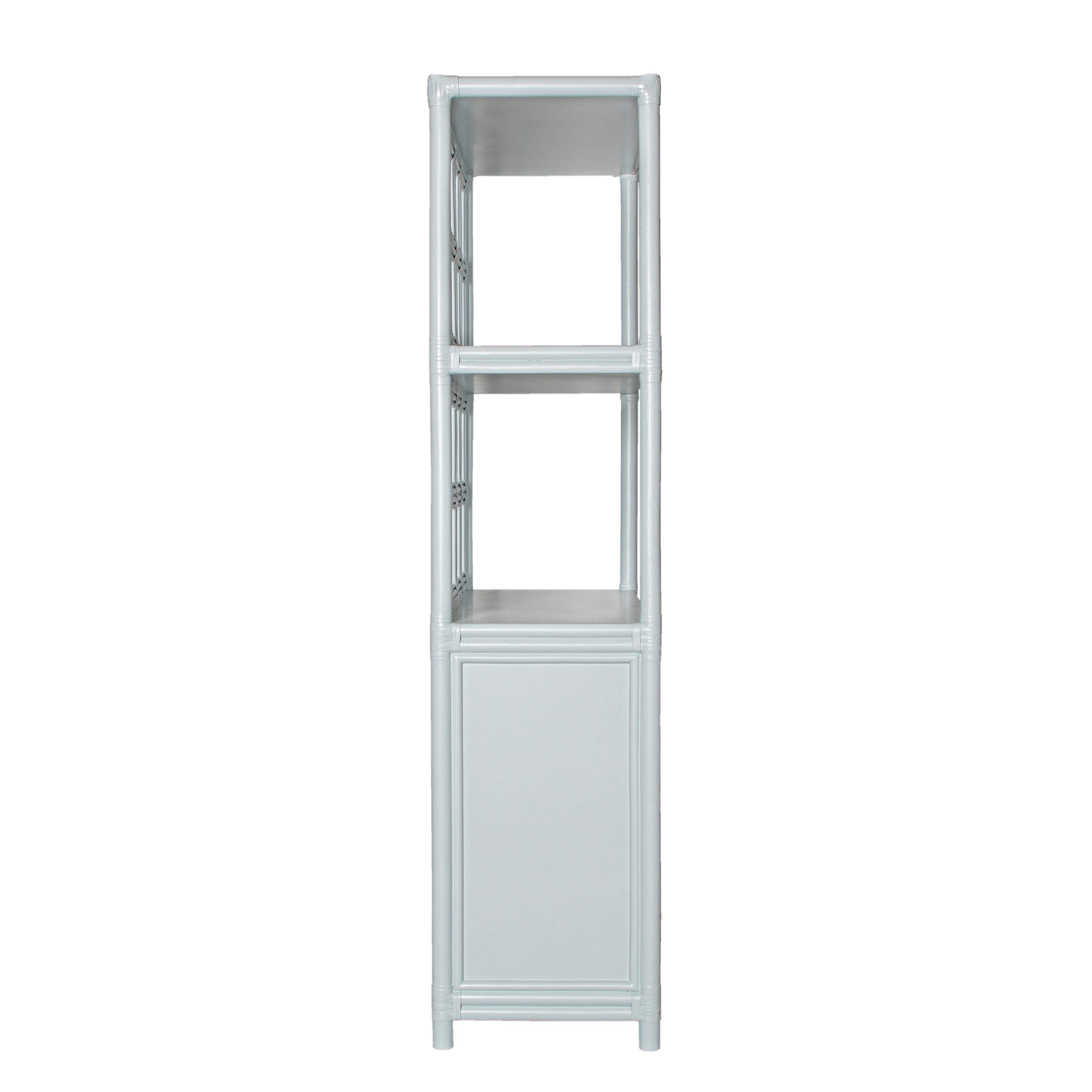 Introducing the Lucca Etagere. Sustainably handcrafted with a wood and rattan frame and leather bindings, this etagere offers 2 shelves and a two door compartment for all your storage needs. Choose from a variety of finishes to match your style. Elevate your space with this exclusive statement piece.