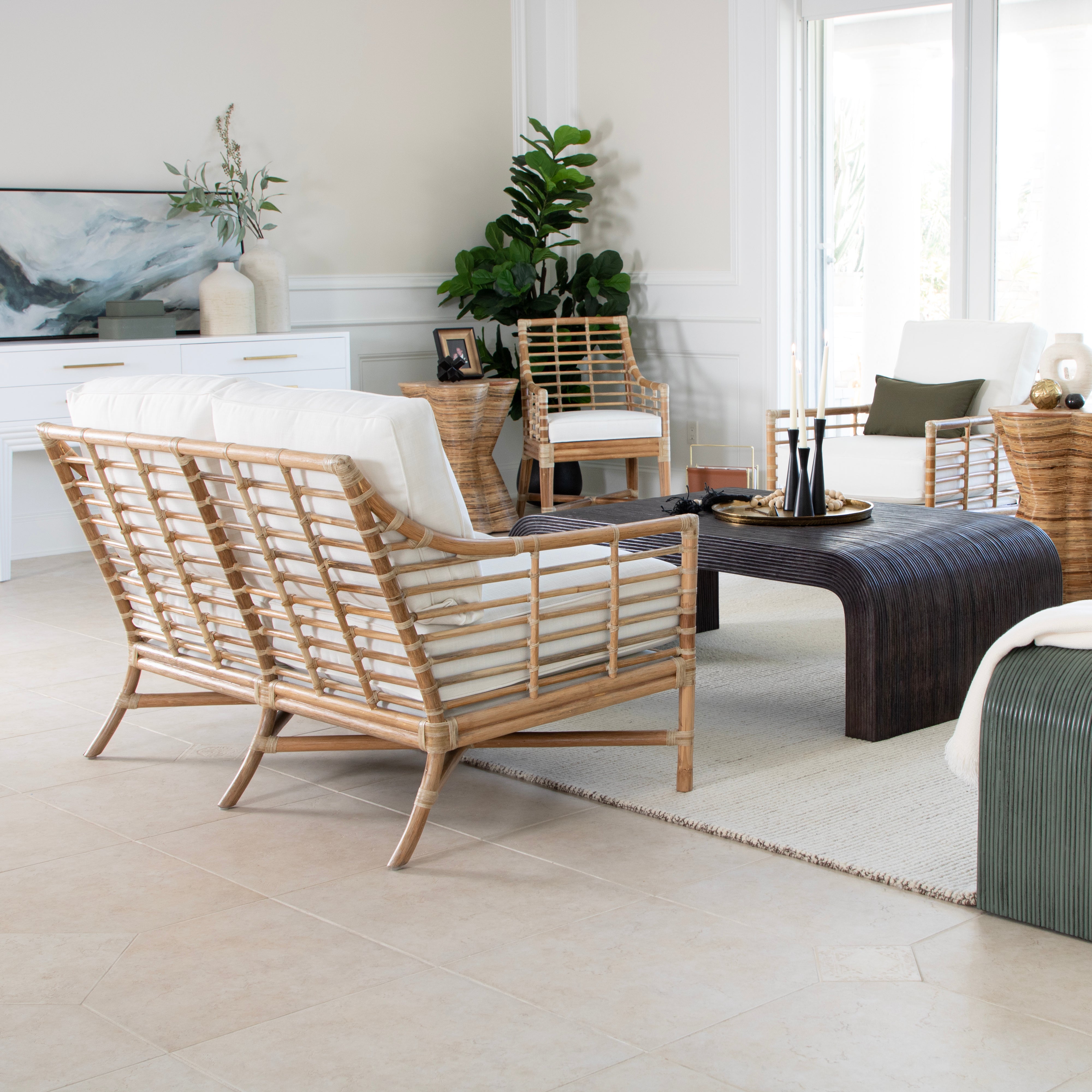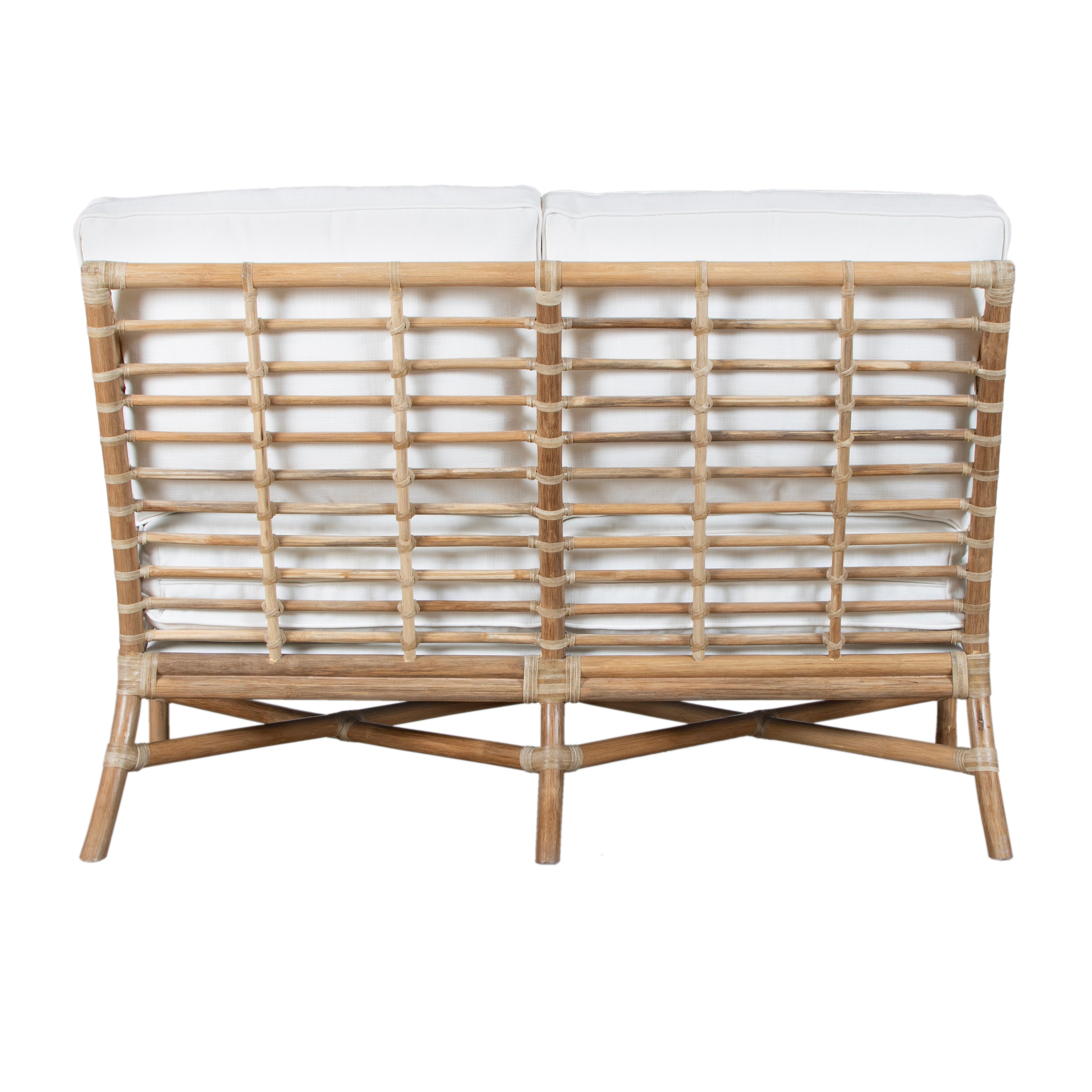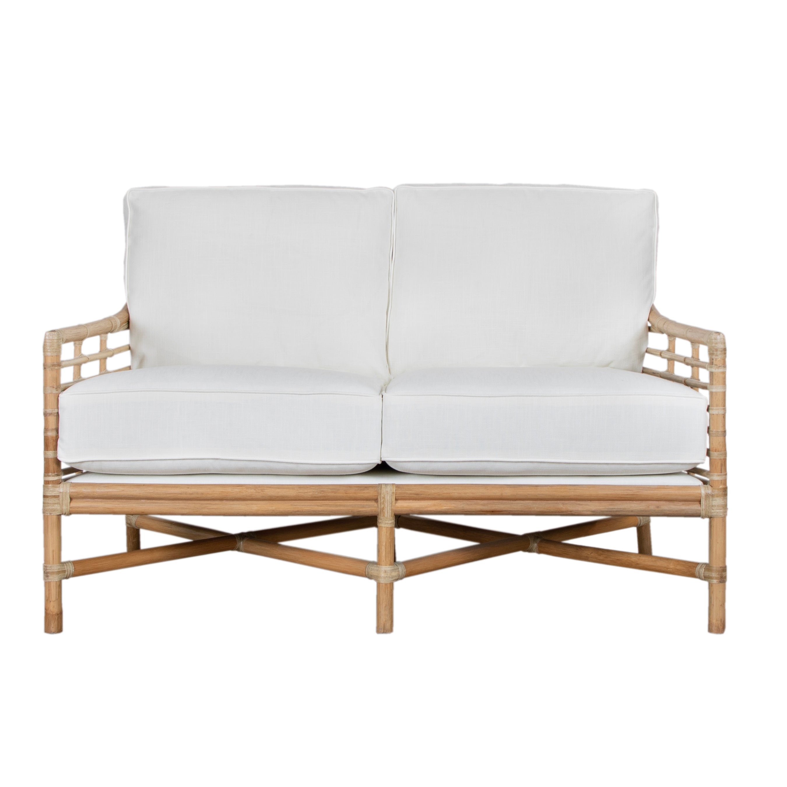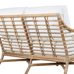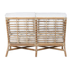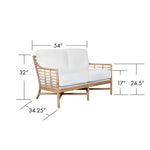 Experience modern sustainable elegance with the Luna Loveseat. Its sophisticated design, crafted from natural rattan and leather bindings, adds a touch of luxury to any space. Choose from a variety of finishes and fabrics, including Sunbrella and insideOut performance options or your very own COM to fit your design aesthetic. A Spring & Down cushion upgrade is also available!