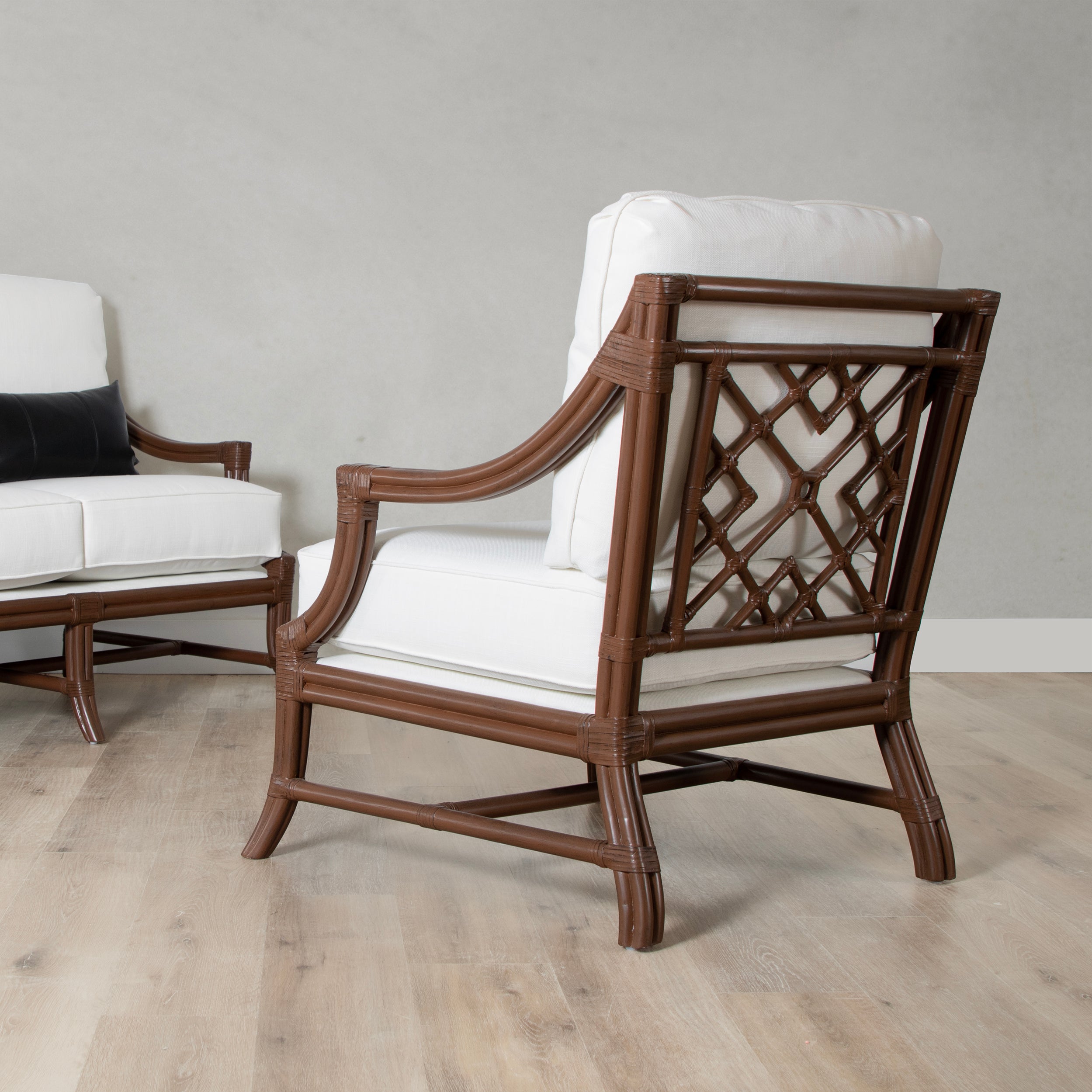 Add a touch of timeless elegance to your living space with the Mosaic Lounge Chair. Sustainably handcrafted with a sturdy rattan frame and leather bindings, this chair exudes classic charm. Choose from a variety of finishes, performance fabrics, or your COM. Upgrade to a Spring & Down cushion for ultimate comfort.