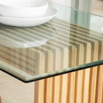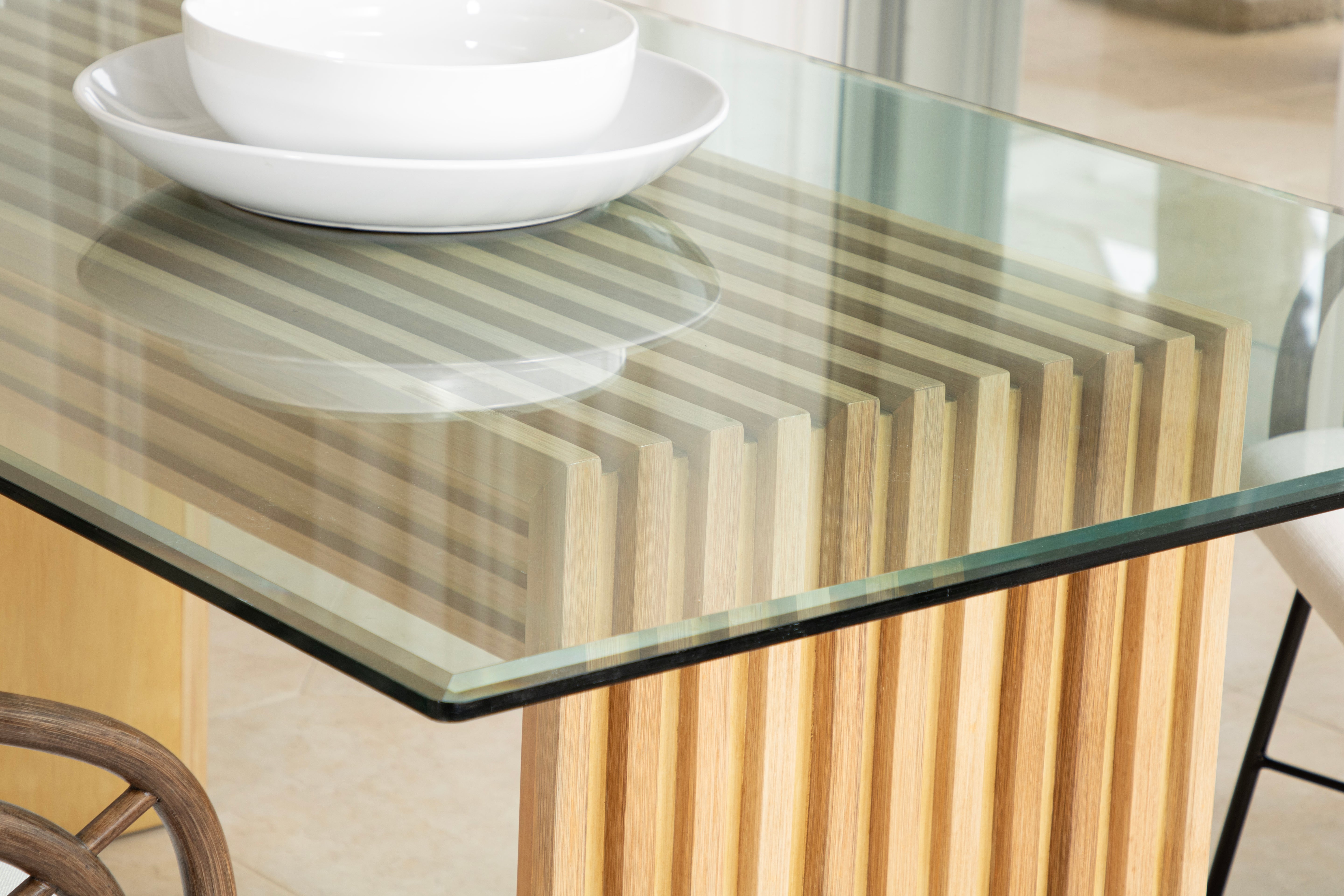 The Nova Table Base is a bold expression of linear texture and architectural precision. A beveled wood frame forms the foundation, while square rattan poles are applied in rhythmic succession along the surfaces, creating depth, shadow, and movement. Clean, sculptural, and endlessly versatile, this base anchors dining or workspaces with quiet strength and modern warmth. Available in any finish!