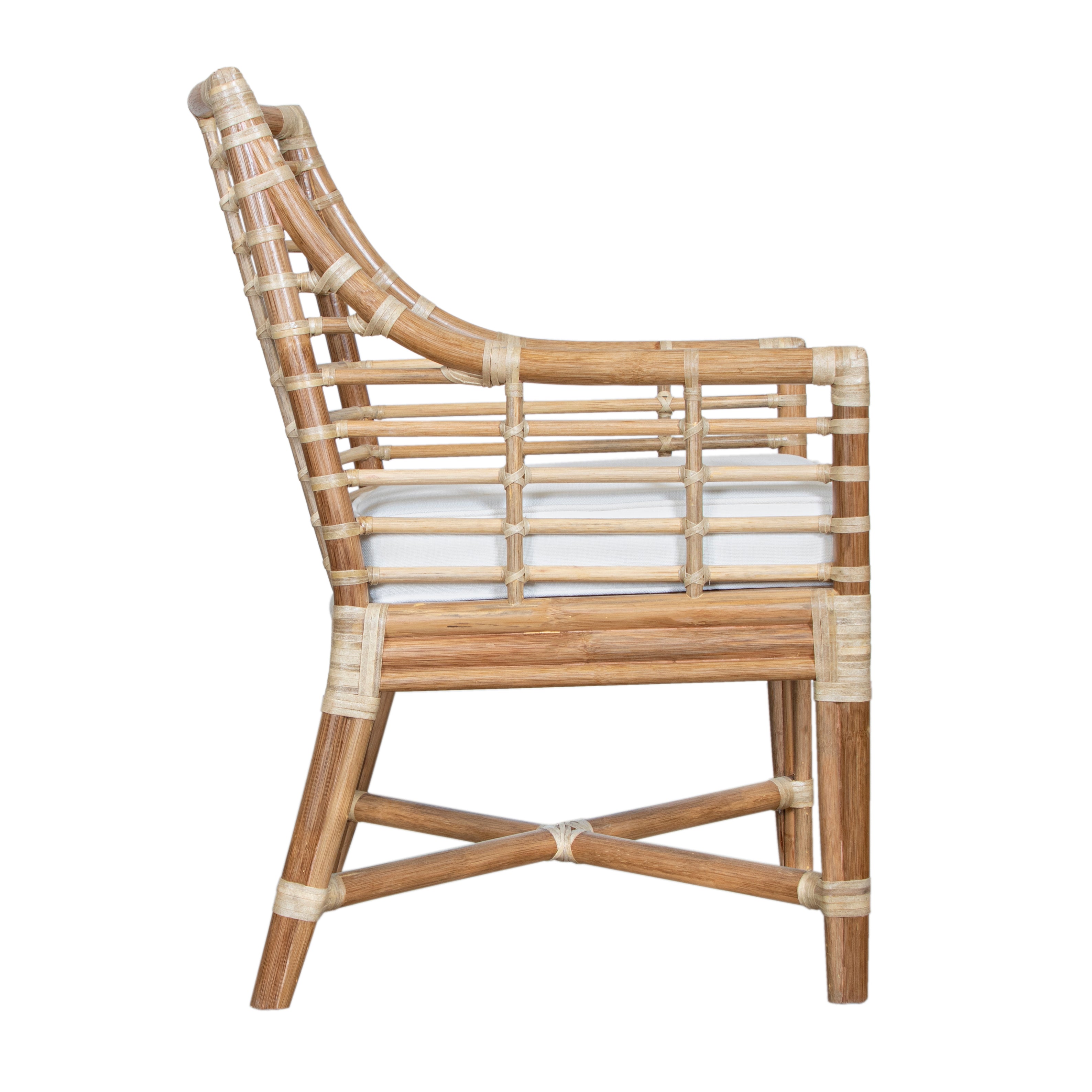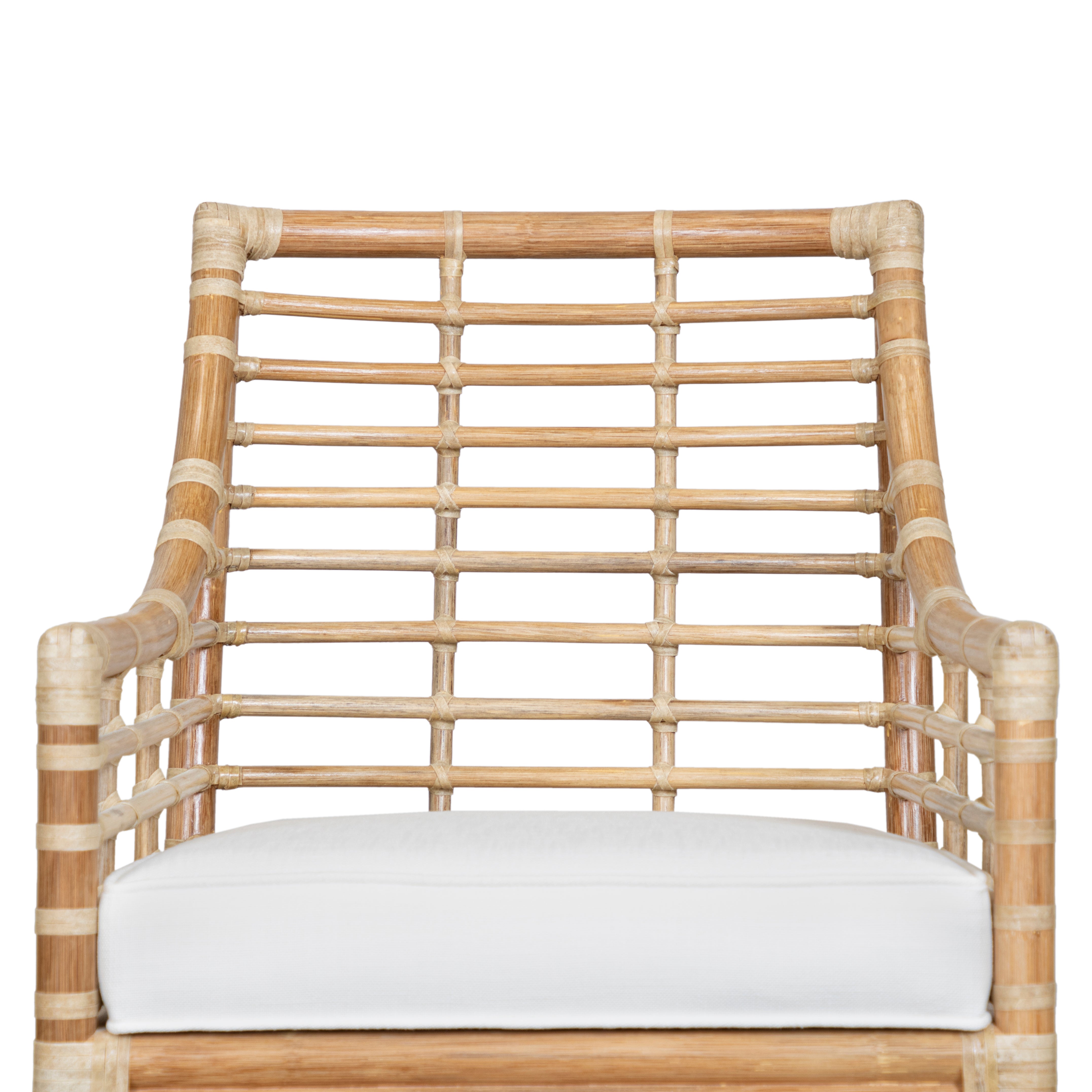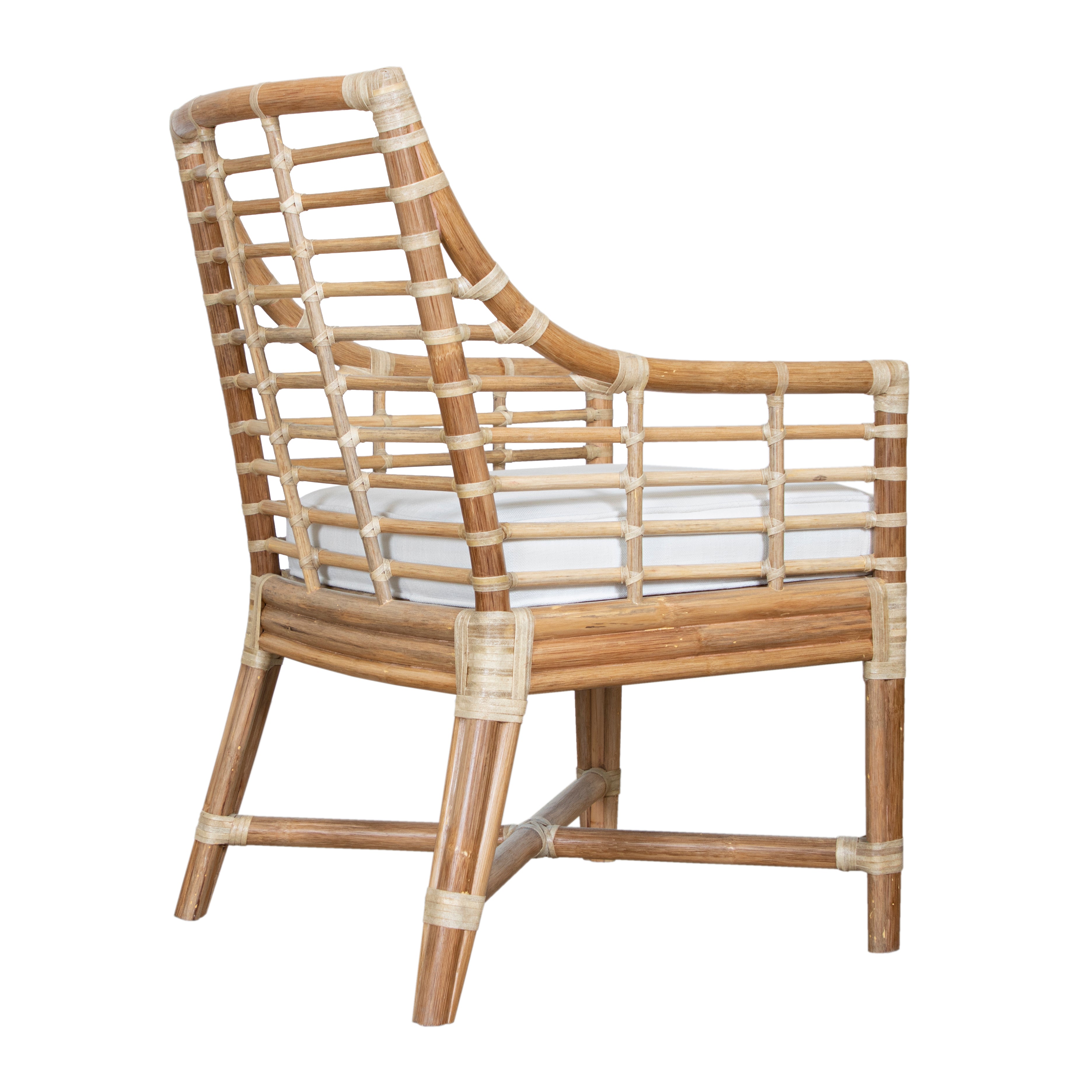 Experience modern sustainable elegance with the Luna Armchair. Its sophisticated design, crafted from natural rattan and rawhide bindings, adds a touch of luxury to any space.